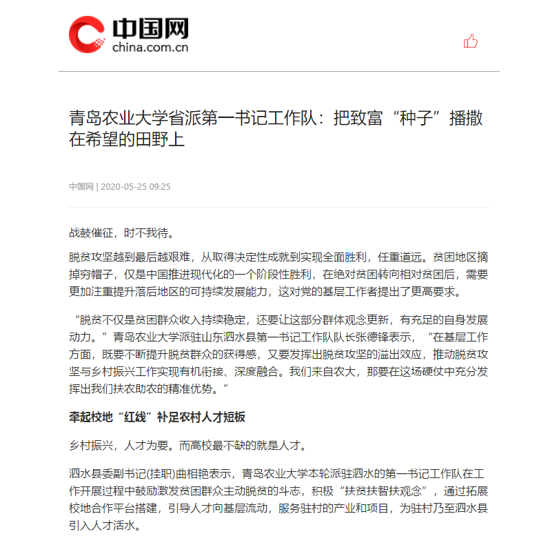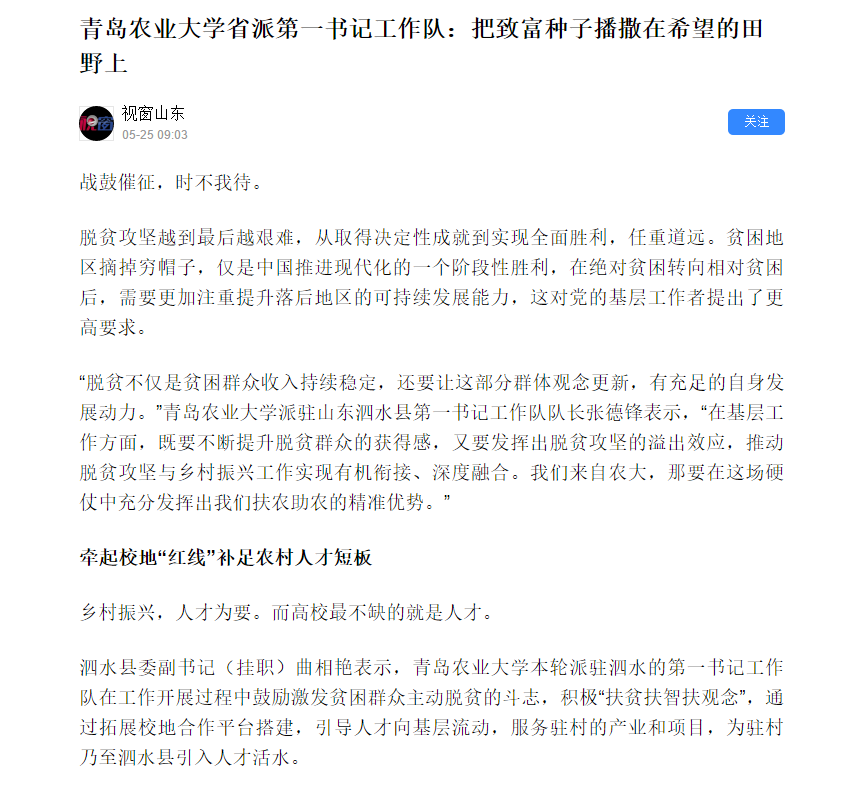 “脱贫不仅是贫困群众收入持续稳定,还要让这部分群体观念更新,有充足的自身发展动力。”青岛农业大学派驻山东泗水县第一书记工作队队长张德锋表示,“在基层工作方面,既要不断提升脱贫群众的获得感,又要发挥出脱贫攻坚的溢出效应,推动脱贫攻坚与乡村振兴工作实现有机衔接、深度融合。我们来自农大,那要在这场硬仗中充分发挥出我们扶农助农的精准优势。”